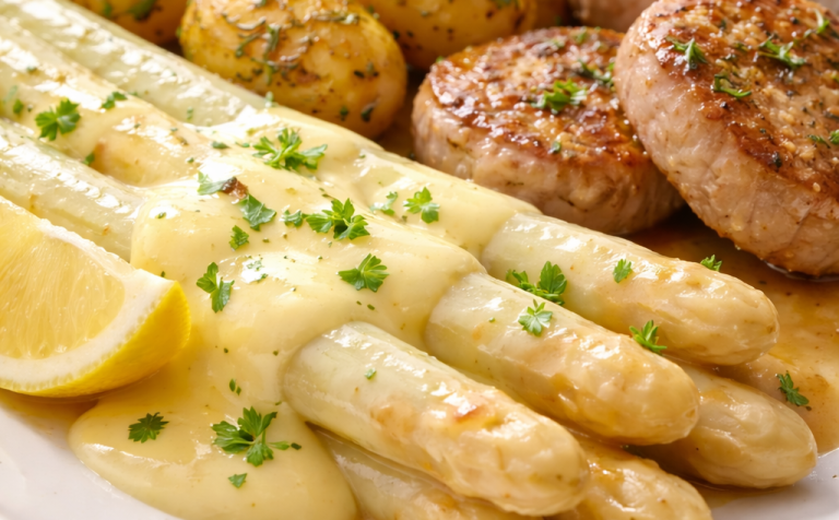 Lintorfer Spargel, Hollandaise, Rosmarinkartoffeln und Schweinemedaillons